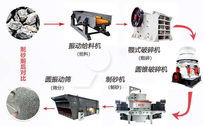 上文是對整形制砂設備的簡單介紹,如果石頭個頭比較大還是需要配置破碎機,一整套制砂設備效率才會更高,一整套碎石整形制砂設備有: