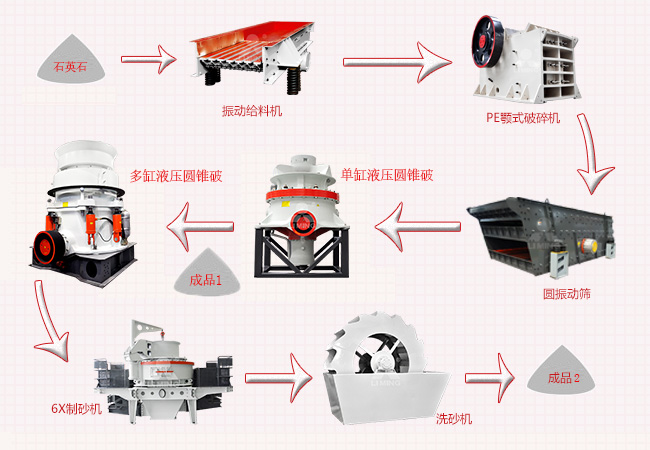 經典的石英石環保工藝流程為:石英石由振動給料機輸送到顎式破碎機進行初次破碎,得到的物料在進入到反擊式破碎機進行下一步驟的破碎,得到較小的物料顆粒,經過圓振動篩把符合要求的篩分出來進入到制砂機細碎,不符合要求的就返回反擊式破碎機重新破碎,直至符合要求進入制砂機,同理,制砂機出來的物料不符合要求的在重新返回制砂機細碎,如此循環往復,從制砂機出來的物料便成為符合規格大小的石英砂。