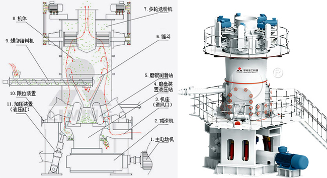 LUM超細(xì)立磨主電機(jī)通過減速機(jī)帶動(dòng)磨盤轉(zhuǎn)動(dòng),同時(shí)風(fēng)從進(jìn)風(fēng)口進(jìn)入磨機(jī),物料經(jīng)螺旋給料機(jī)下料口落在磨盤中央,在離心力的作用下,物料從磨盤中央向邊緣均勻移動(dòng),經(jīng)過磨盤上的粉磨輥道區(qū)域時(shí),受到磨輥的碾壓,大塊物料直接被壓碎,細(xì)粒物料受擠壓后形成料床進(jìn)行粒間粉碎。被粉碎的物料繼續(xù)向磨盤邊緣移動(dòng),直到被風(fēng)環(huán)處的強(qiáng)氣流帶走,而較大的顆粒物料又重新掉落到磨盤上繼續(xù)粉碎,氣流中的物料經(jīng)過上部的分離器時(shí),在轉(zhuǎn)子葉片的作用下,粗顆粒重新回到磨盤上粉磨,合格的細(xì)粉隨氣流一起出磨,被系統(tǒng)的集粉器收集,被收集到的粉料即為超細(xì)立磨磨出的產(chǎn)品。
