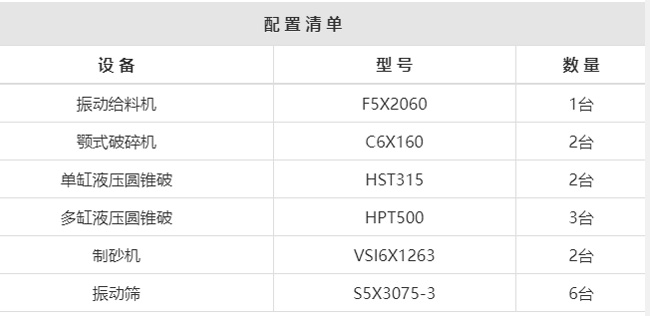 想要打造時產1500噸這樣的的大型制砂生產線,在生產工藝及設備選擇上尤為重要,采用三段式破碎的生產工藝,多碎多篩使得石頭被充分研磨破碎,成品粒形規則、大小均勻。用到的核心破碎設備是顎式破碎機+單缸圓錐破碎機+多缸圓錐破碎機,需要制砂再加制砂機。全套設備配置清單如下: